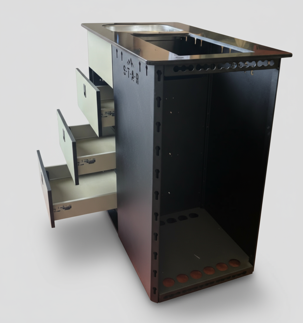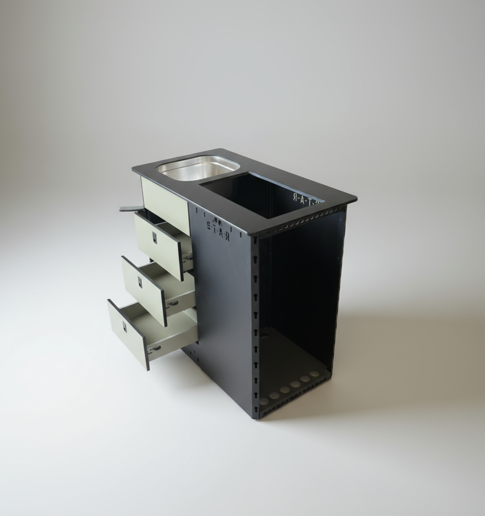 Crafted in the UK. This lightweight Camper Kitchen Pod is built from durable aluminium and features a powder-coated finish. Available in multiple colours. Designed to fit Sprinter, Crafter, and Fiat vans. It offers a robust, corrosion-resistant solution for mobile cooking, combining practical design with expert craftsmanship for reliable performance on every adventure.